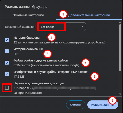 3. На закладке "Дополнительные" обязательно поставить галочку напротив пункта "Настройки сайта", после чего нажать кнопку "Удалить данные".