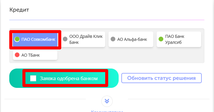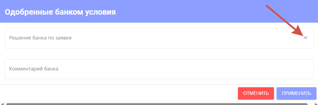 3. Откроется форма для выбора решения от банка, нажав на скобку выберете статус "Заявка одобрена банком"