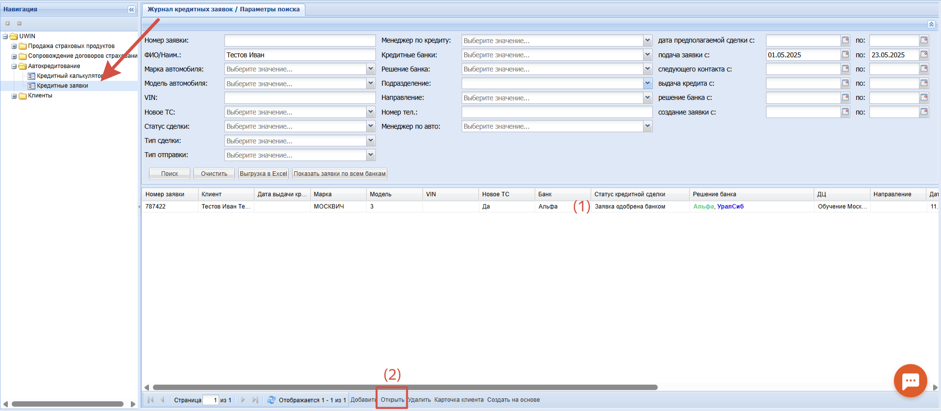 1. Откройте нужную кредитную заявку см. (1) через журнал кредитных сделок, можно воспользоваться фильтрами, к примеру, ФИО, дата подачи заявки или номер заявки