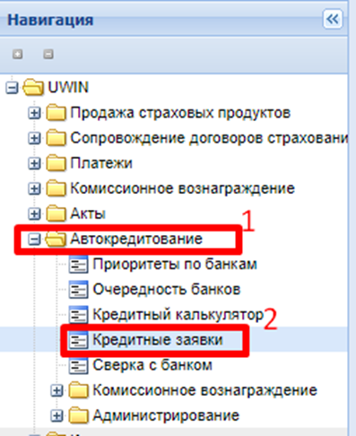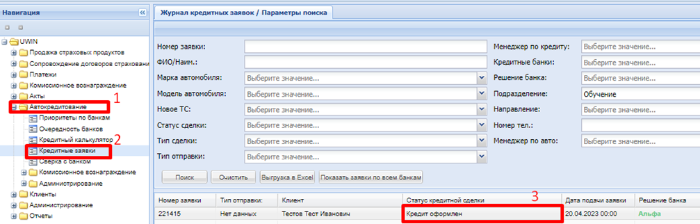 1. Откройте журнал кредитных сделок. Автокредитование => Кредитные заявки