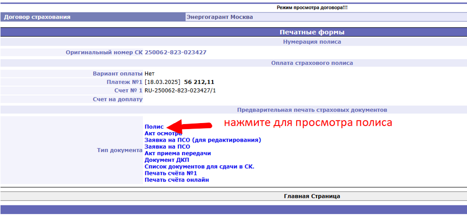 2. Система откроет страницу печатных форм оформленного полиса.