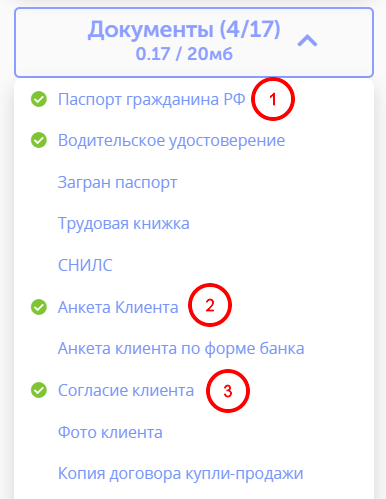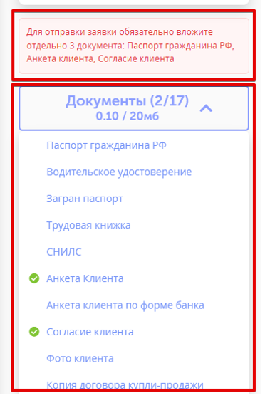 Для отправки кредитной заявки в банки на рассмотрение требуется вложить минимальный перечень сканов документов заемщика