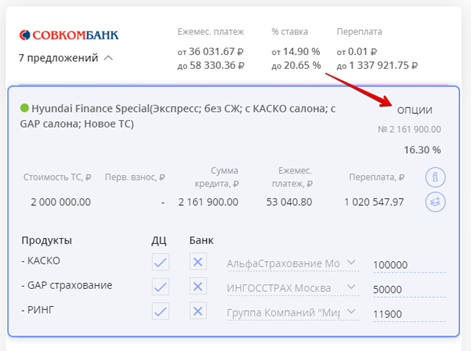 Если требуется произвести выбор банковских опций, то следует нажать на кнопку «Опции»