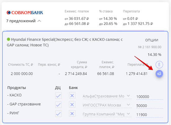 Также можно изменить кредитную программу, параметры кредита в столбце «Оформлено», страховые продукты, включенные в кредит, в соответствии с подписанным кредитным договором.