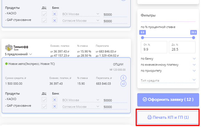 Для печати коммерческого предложения и графика платежей необходимо нажать на иконку с рисунком страниц в блоке интересующих банковских программ