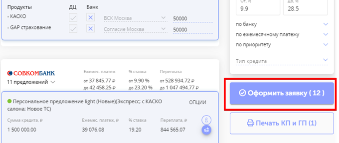 Для перехода на этап заполнения кредитной заявки требуется нажать кнопку «Оформить заявку»