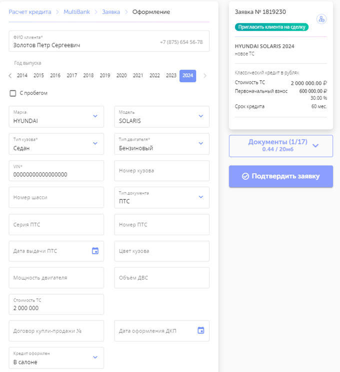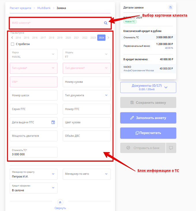 Система произведет переход на страницу кредитной заявки. На данном этапе требуется произвести заполнение дополнительной информации по клиенту и ТС.