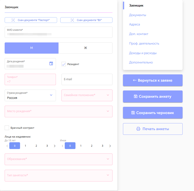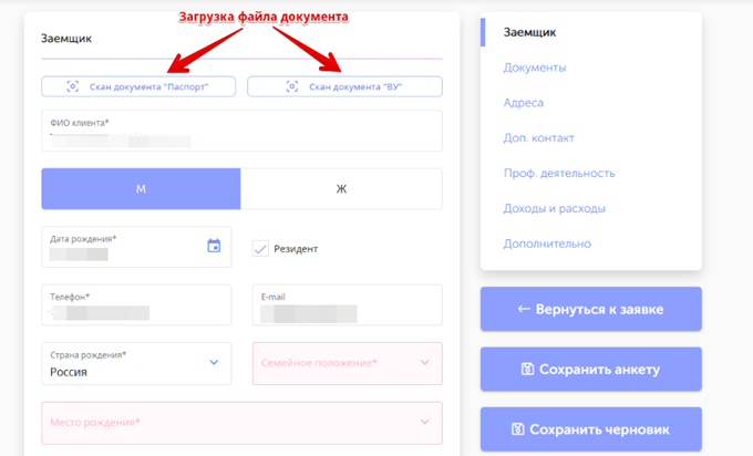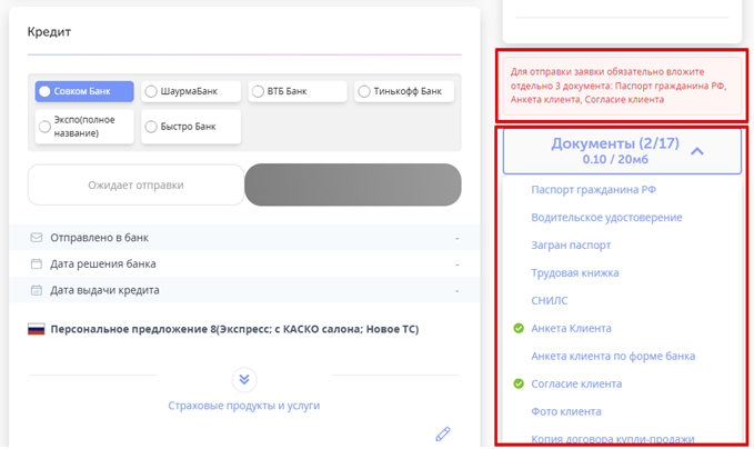 Для отправки кредитной заявки в банки на рассмотрение требуется вложить минимальный перечень сканов документов заемщика: Паспорт гражданина РФ, Анкета клиента, Согласие клиента