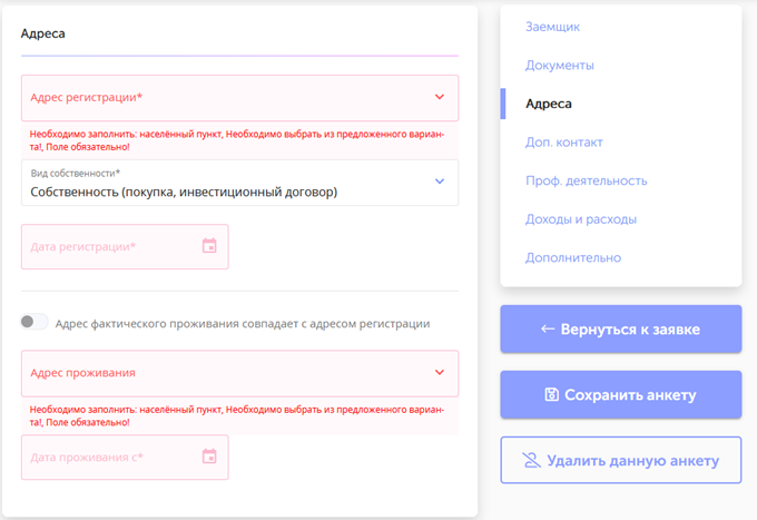 Далее процесс не отличается от первичного заполнения данных в заявке.