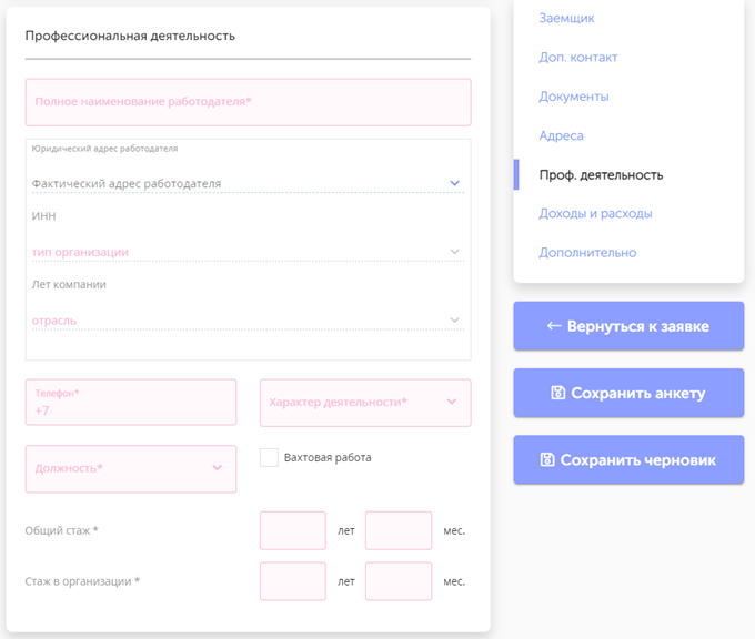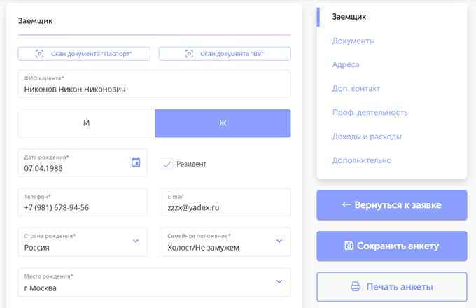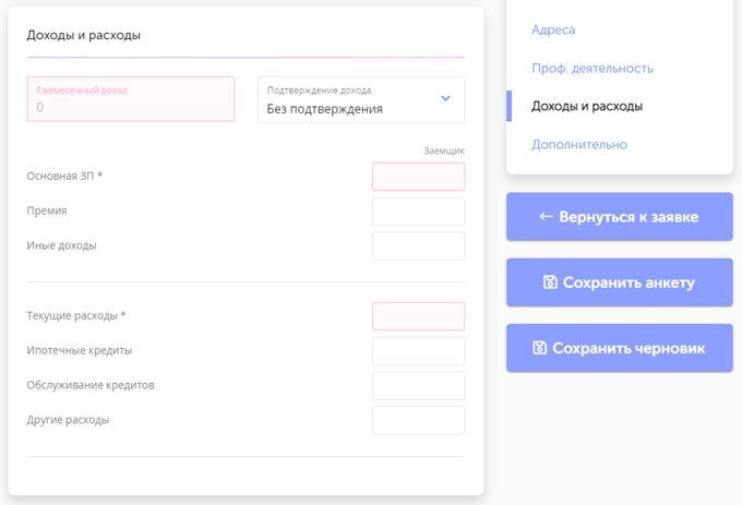 После заполнения данных требуется нажать кнопку «Сохранить заявку» и перейти к заполнению кредитной анкеты.