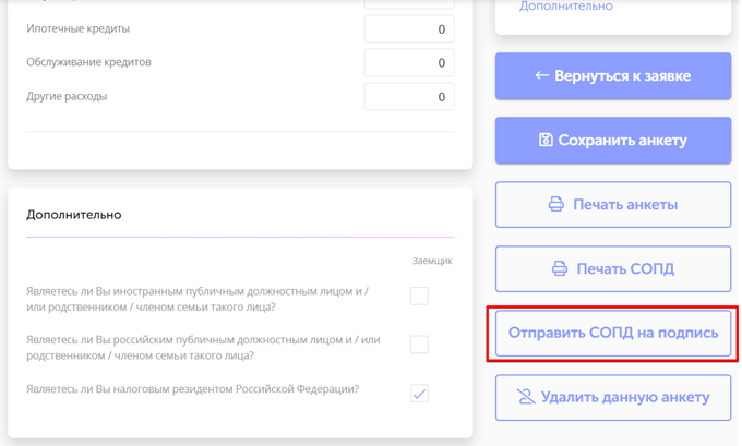 Для этого после сохранения кредитной анкеты следует воспользоваться кнопкой «Отправить СОПД на подпись».