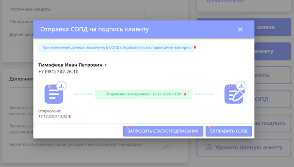 8. Напоминание о необходимости повторной отправки СОПД на подписание, если клиентские данные в анкете были изменены.
