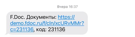 После нажатия на кнопку «Отправить СОПД» клиенту на указанный номер телефона поступит СМС - сообщение с электронной ссылкой и кодом для входа.