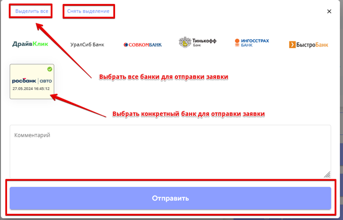 Требуется выбрать банки для передачи заявки на рассмотрение и нажать кнопку «Отправить»