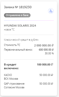 После успешной отправки заявки в банки в блоке информации статус кредитной заявки будет изменен на «Отправлена в банк».