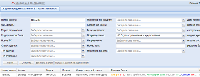 С помощью фильтров в журнале произвести поиск ранее отправленной кредитной заявки.