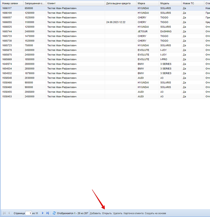 Для получения более подробной информации требуется перейти снова в интерфейс заполнения кредитной заявки. Для этого в журнале требуется выбрать кредитную заявку и нажать на кнопку «Открыть».