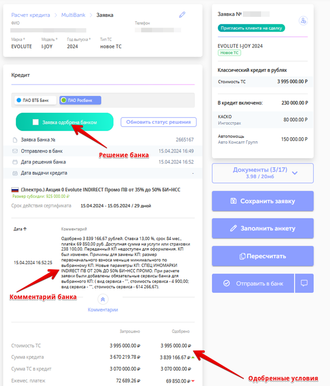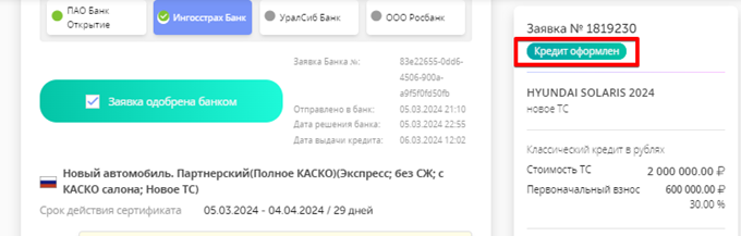 После того, как банки предоставят решения и клиент подпишет кредитный договор, заявку следует перевести в статус «Кредит оформлен».