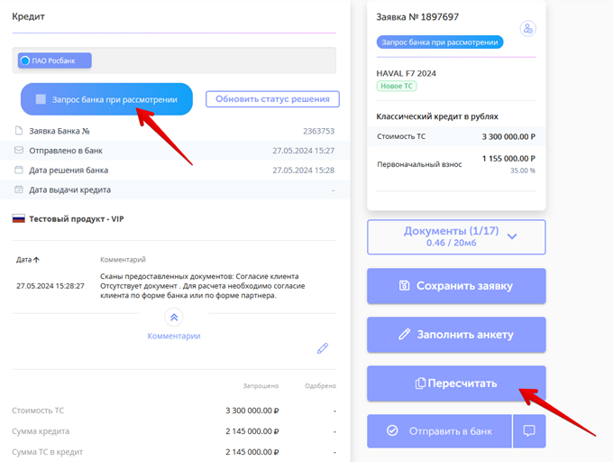 При получении от банка решения «Запрос банка при рассмотрении» или для добавления новых банков в заявку требуется нажать на кнопку «Пересчитать».