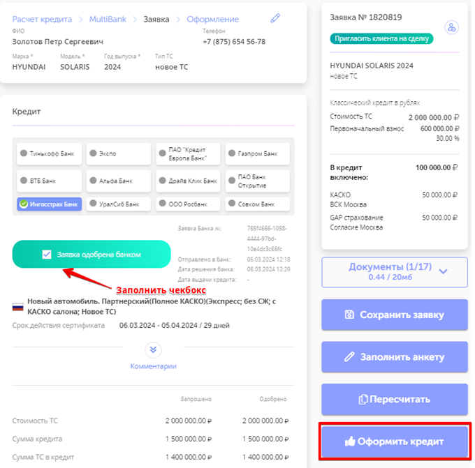 Для этого требуется заполнить чекбокс для банка, в котором клиент подписал кредитный договор. Сразу после этого кнопка «Оформить кредит» станет доступной.