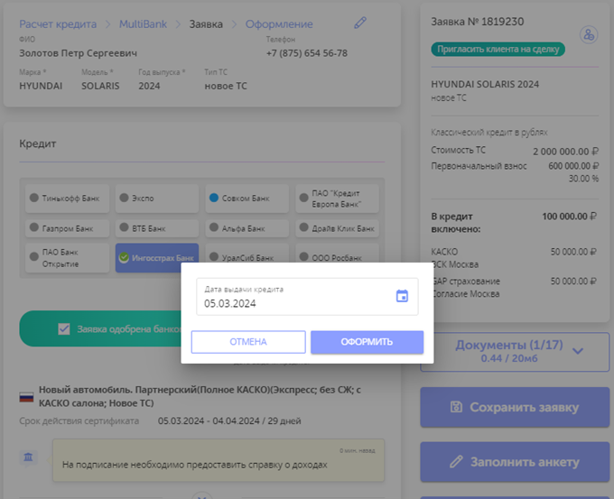 После нажатия на «Оформить кредит» следует выбрать дату подписания кредитного договора клиентом и нажать «Оформить».