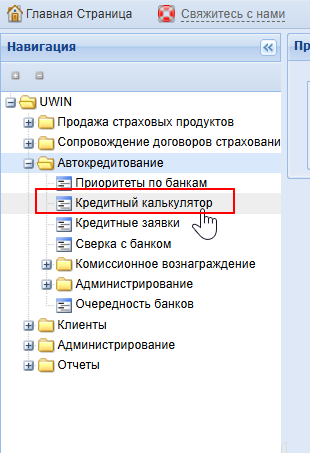 В системе UW перейти в меню Автокредитование -> Кредитный калькулятор